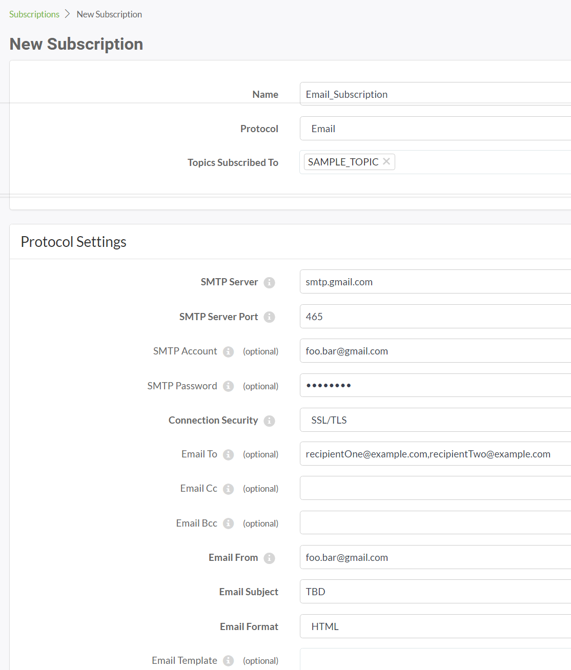 - Topics Subscribed To: Specify the Topics you want to subscribe to using the drop-down selector. To create a topic and use it right away, click +.