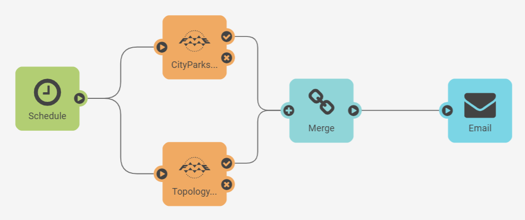 Use the Merge Messages action to combine messages before proceeding with a workflow. This example merges the messages from two FME Form workspaces before sending an email. The combined message does not arrive at the Email external action until both workspaces have successfully completed.