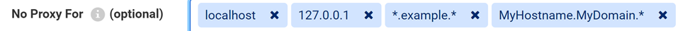 - No Proxy For: (optional) A list of hostnames and IP addresses that will be accessed through a direct connection, bypassing the proxy. To avoid entering multiple hosts in the same domain, hosts can be prefixed and appended with the wildcard character *.